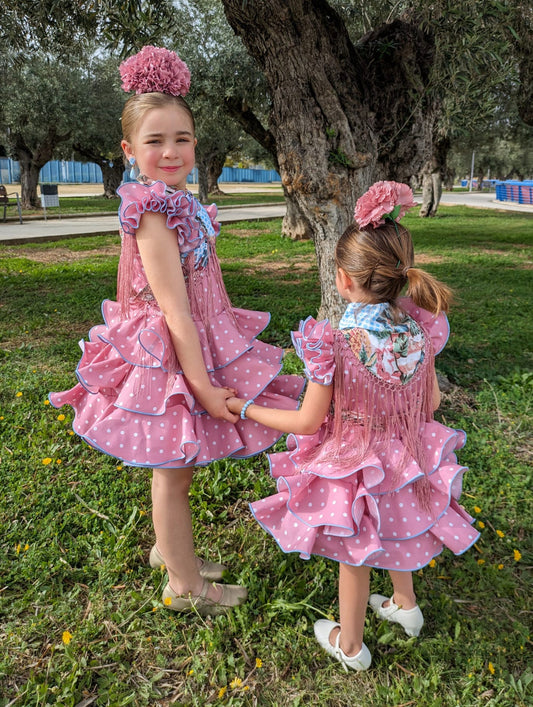 Vestido de flamenca largo rosa bebé lunar blanco niña