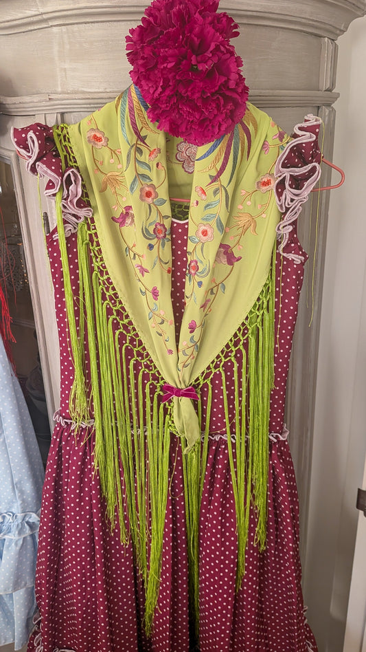 Vestido Flamenca Largo Niña Verde Empolvado Lunar Blanco