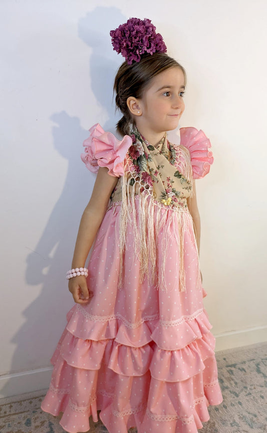 Vestido flamenca capricho rosa maquillaje con lazos de terciopelo