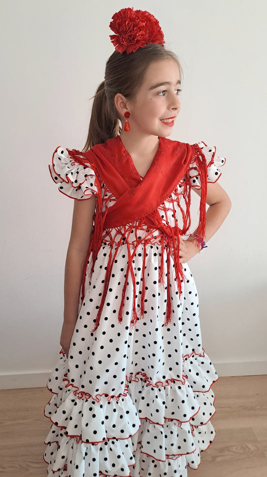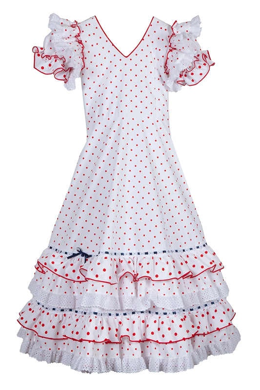 Vestido flamenca blanco lunar rojo tira bordada blanca