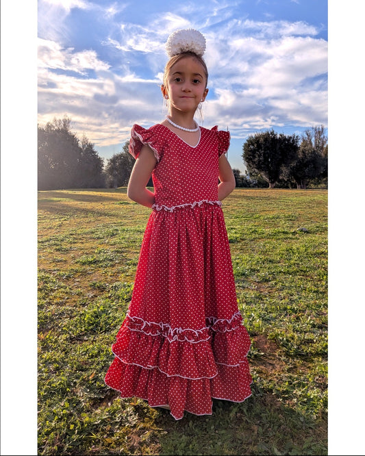 Vestido Flamenca Niña Rojo Lunar Blanco