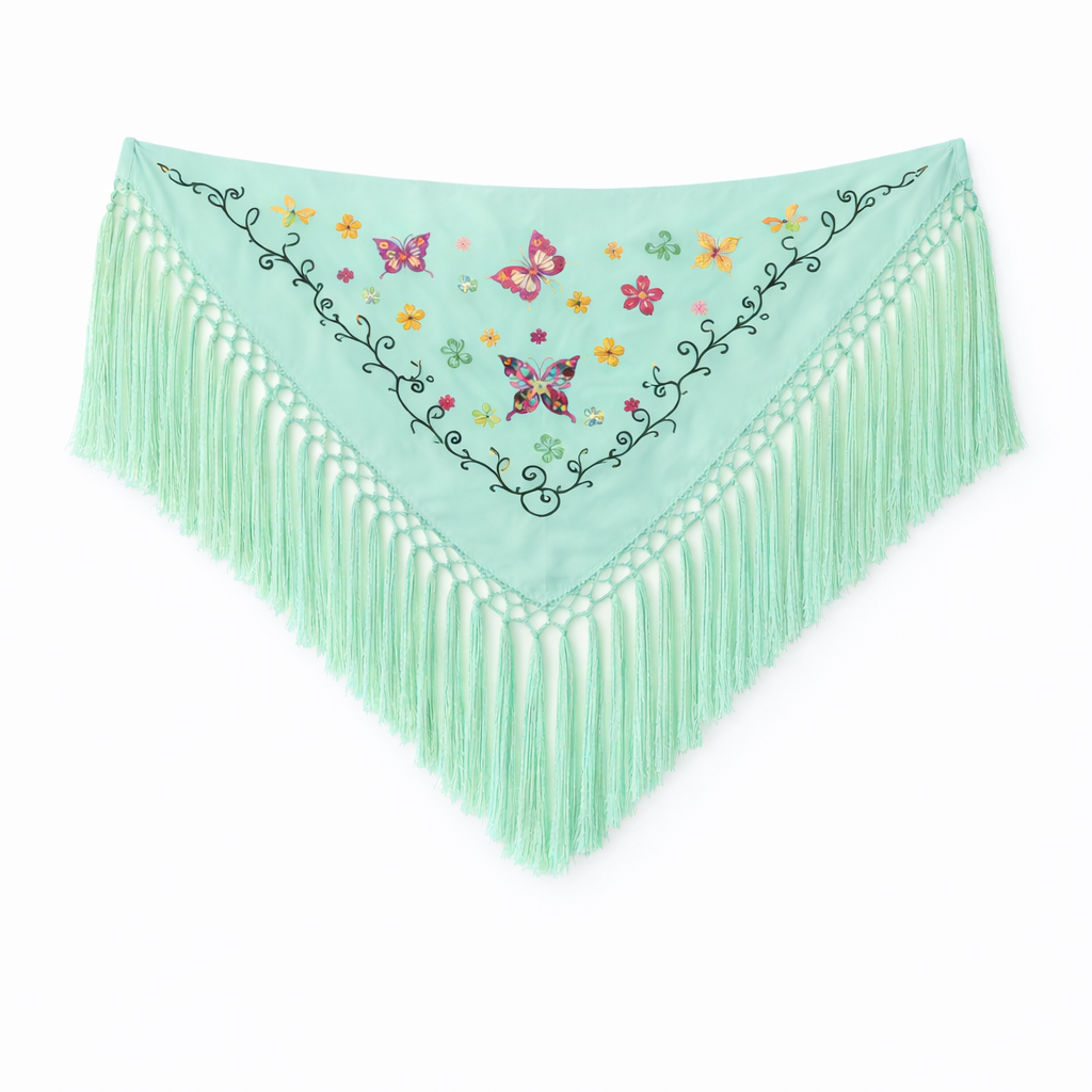 Descubre el encanto del sur con este mantoncillo bordado jabonoso para niña, una pieza con bordado de mariposa multicolor y fleco corto. Este accesorio tradicional es perfecto para dar un toque andaluz auténtico a los trajes de feria de las más pequeñas.