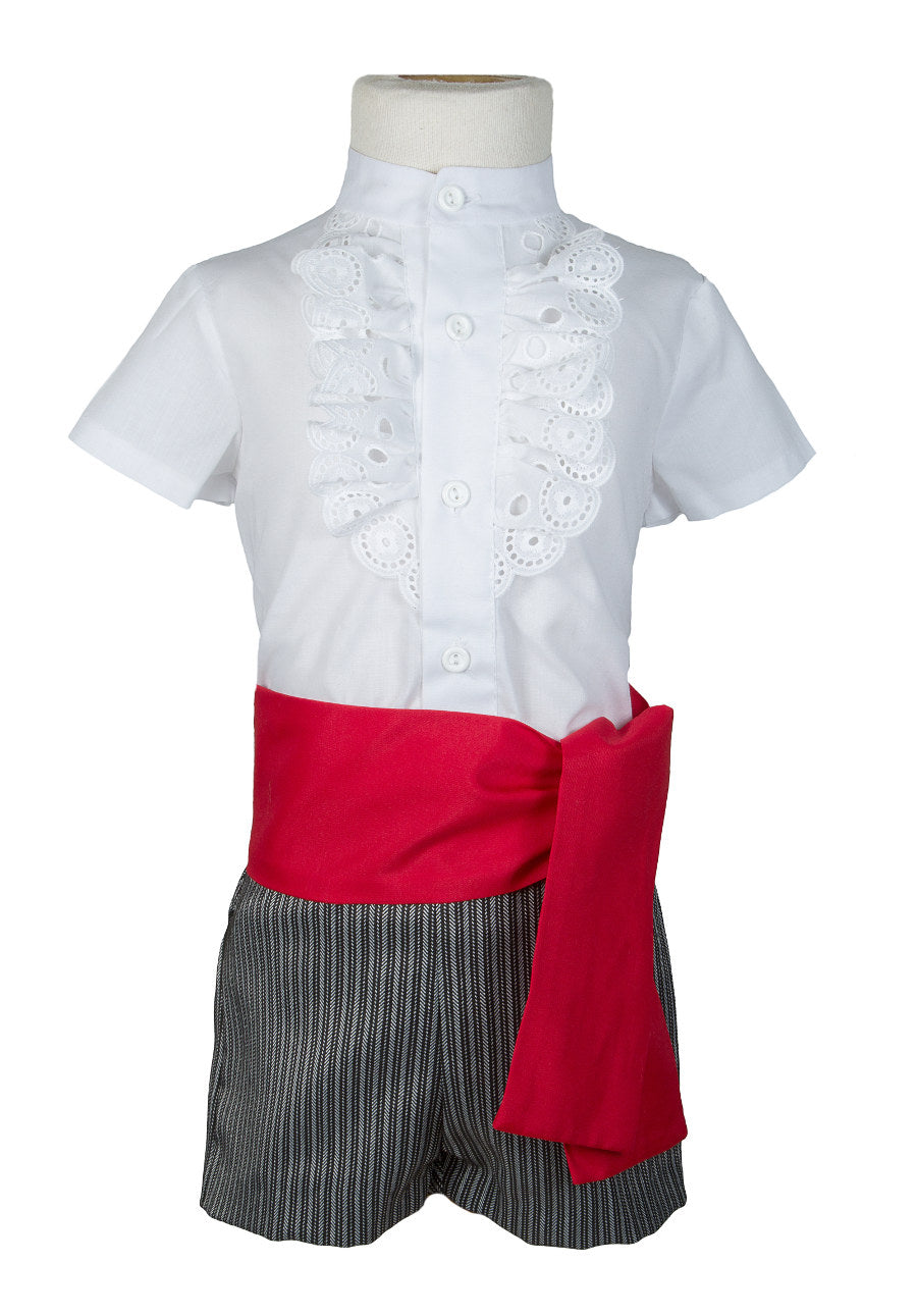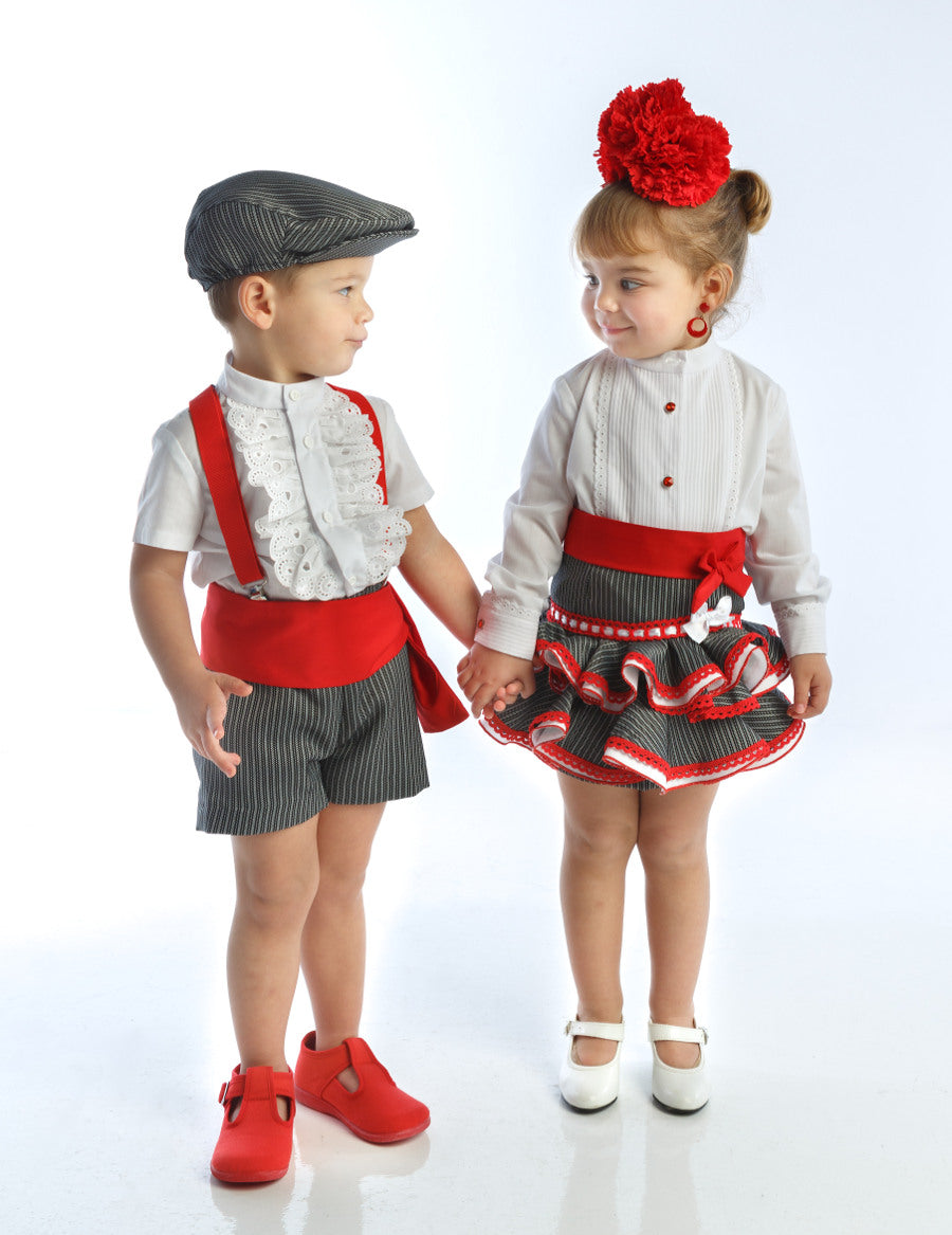 No hace falta resaltar lo guapos que están los niños vestidos de gitano. Si quieres completar el modelo (para hacerle un reportaje fotográfico, por ejemplo; o con motivo de un evento especial), detalles como unos tirantes a juego con el fajín rojo o una boina campera realizada a mano pueden quedar todavía más cucos. Consulte más trajes de niño vestido de gitano.